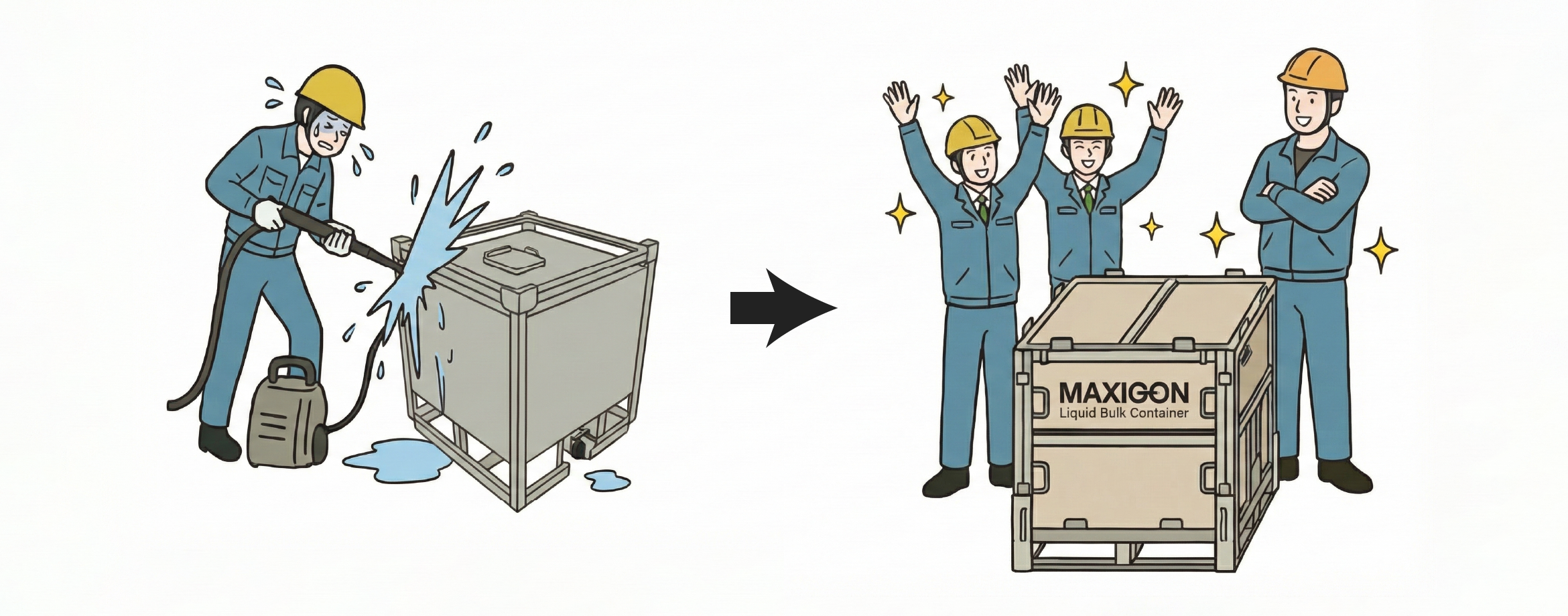 X社様では、大型投資をせずに容器不足を解消できるとマキシコンを採用頂くことになりました。今では経年劣化したステンレスタンクからマキシコンへの置き換えも徐々に進んでおり、結果的に洗浄作業時間も減り、洗浄作業に従事していた作業者は製品製造に注力できるようになりました。サステナビリティの観点からも、環境負荷軽減に貢献できたと、大変満足されています。